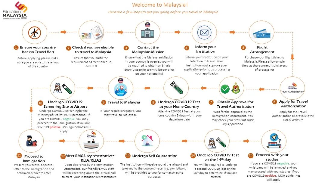 在大家入境大马的前3天,须进行聚合酶链反应或快速抗原检测试剂盒的检测,并在马来西亚入境处接受健康筛检,接着在各自院校所指定的地点接受14天隔离,相关的SOP和指南也将不时更新。/ 马来西亚政府的最新签证和旅行建议 /
