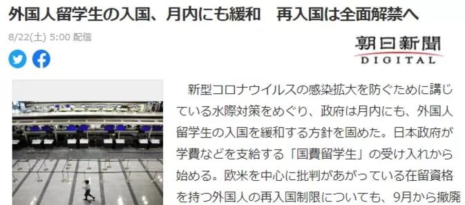 紧接着根据22号《朝日新闻》报道,日本政府将从本月起首先放宽对由日本政府资助留学生的入境限制,此后将研究放宽对“私费”留学生(即非日本政府资助留学生)的入境限制。