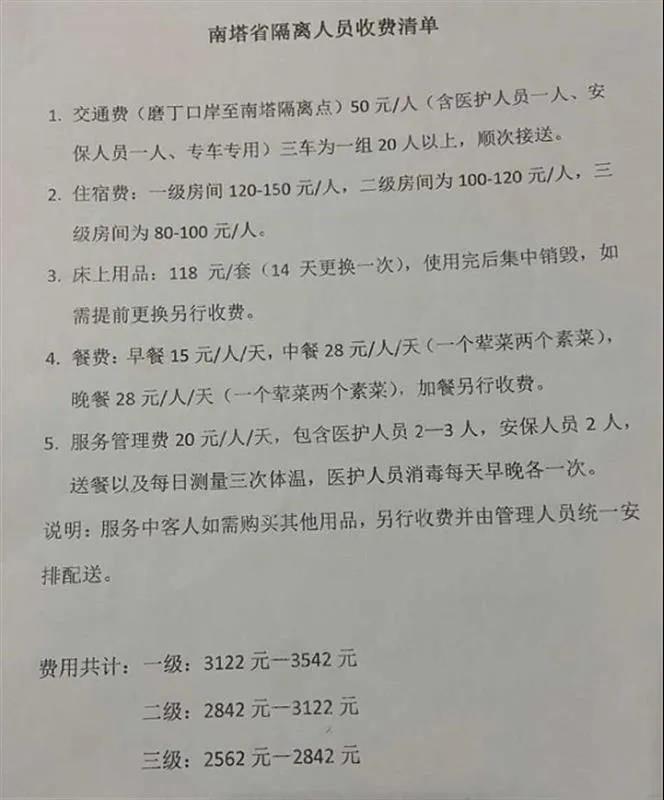 房间费用30美金至360美金不等。最近隔离费用下降,包3餐,14天隔离费用在3500元至5000元左右。