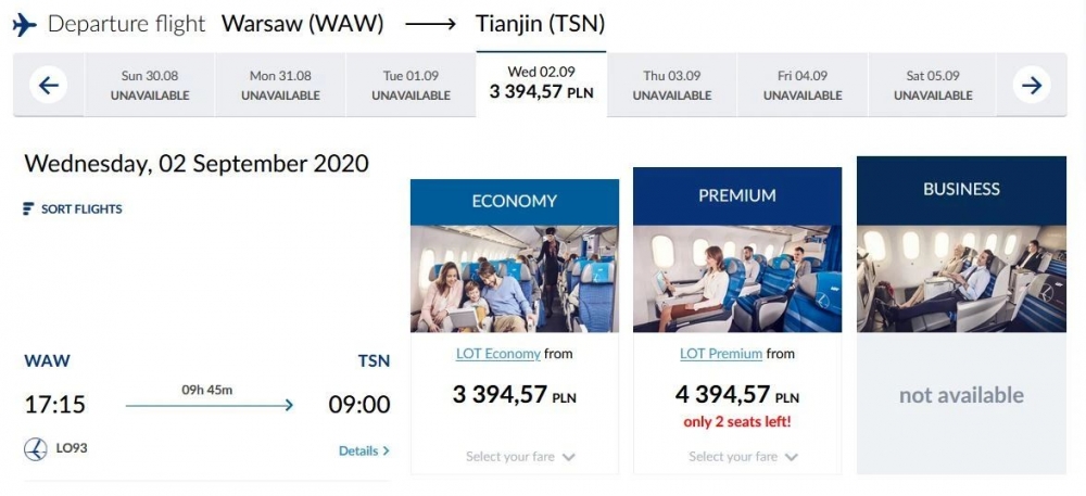 经和波航方面确认,波航从天津回华沙的航班是载客飞行。在波兰航空的官网上可以看到这样的机票预订,来回票的价格也不贵,但单程票价格不低。