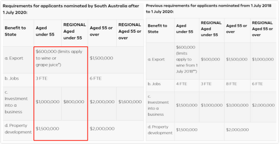 生意投资额度降低了:阿德莱德市区及阿德莱德市区以外的生意投资最低额要求都从原来的150万澳元分别降到100万澳元和80万澳元。而房地产开发类型的生意投资额要求则仍然维持150万澳元的最低额要求。