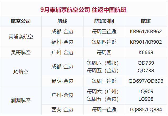 | 澜湄航空 | 广州-金边 | 每周六(广州) 每周五(金边) | LQ909 LQ908 |