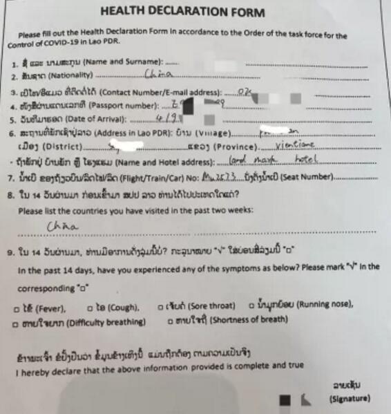 老挝健康申报表