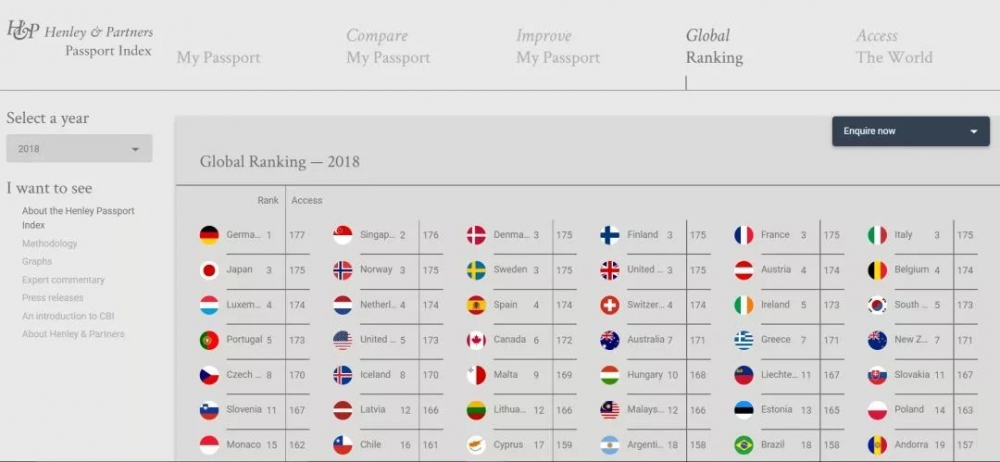 Henley & Partners 咨询公司根据国际航空运输协会(IATA)的数据,于2018年1月9日公布了2018年度亨氏签证受限指数(the Henley Passport Index ),揭晓了各国、地区护照排名。