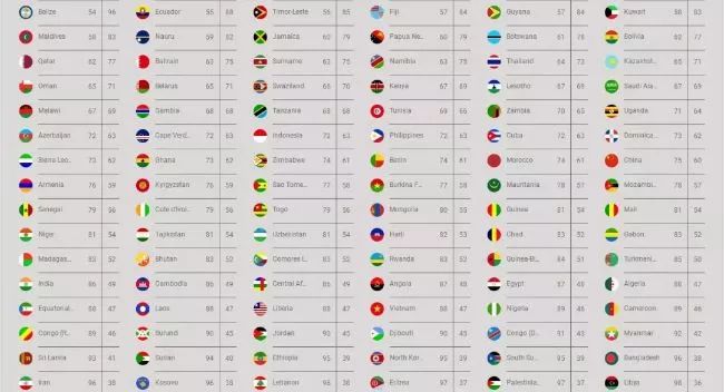 、朝鲜、南苏丹、孟加拉、伊朗、厄立特里亚、巴勒斯坦、利比亚、尼泊尔、也门、索马里、巴基斯坦、叙利亚、伊拉克和阿富汗。这些国家多为贫穷和战乱国家,其免签国家(地区)在40个以下,其中排名104垫底的阿富汗只有24个免签国家,全球最少。