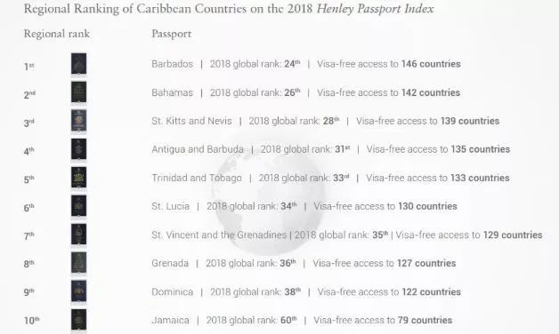 加勒比地区护照好用排行榜,巴巴多斯、巴哈马位居前两名。亨氏签证受限指数(Henley Visa Restrictions Index)是由总部在英国伦敦的咨询公司 The Henley & Partners ,利用国际航空运输协会(IATA)的数据,针对全球不同国家、地区的公民旅游自由度,所做出的排行榜;此指数也被公认为是权威的护照指数。