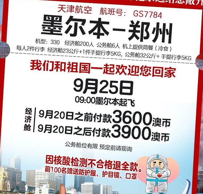 这是墨尔本机场提供的包机商的封城首航宣传海报!官方信息,小编盖章核实!机场确认已通过审批,除非政府有条例取消。