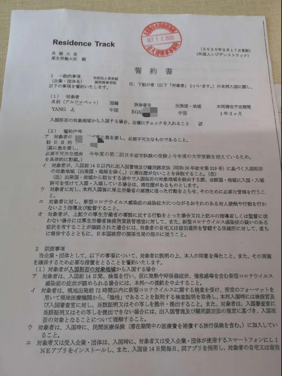 新生终于要来了!时隔8个月,终于有新规留学生要入国了!让人激动的第一号签证!注意!上图的誓约书入境时会被要求提交,所以请大家一定妥善保管,随身携带!