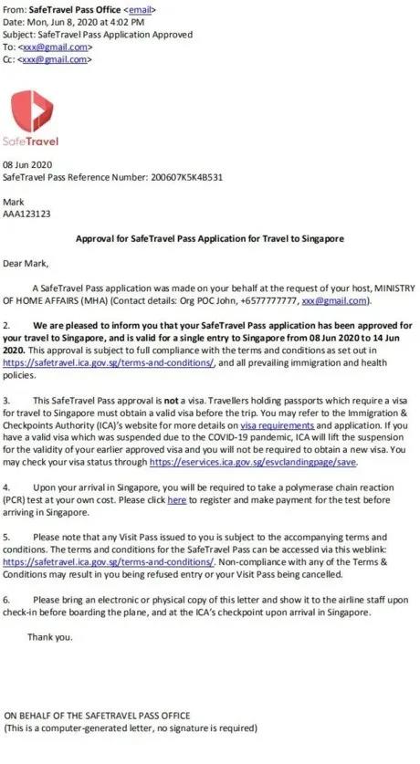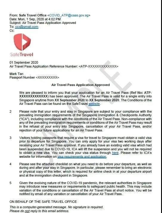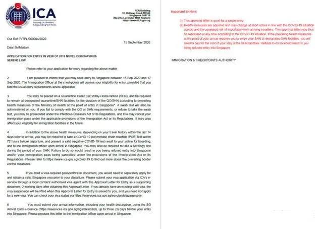 根据新加坡最新的规定,持有有效签证并不保证能够入境,所有短期访客必须通过适当的COVID-19旅行渠道申请获得事先入境批准。简单点来说,签证办下来,还得申请入境批准才可以。然而这个入境批准批不批还得新加坡说了算…根据规定,入境新加坡时必须向工作人员出示三种批准信之一,包括Safe Travel Pass 安心出行证、Air Travel Pass 航空出行证、ICA Approval of Letter of Entry(ALE)移民局入境批准信。不过在申请签证时,可不出示或提交批准信。