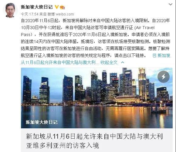 新加坡驻华大使今日也发布了最新政策和入境要求
