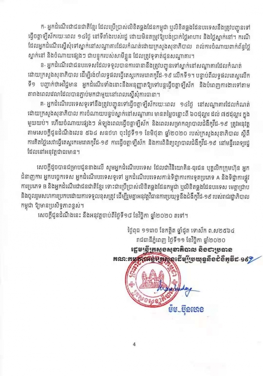 11月11日,卫生部就入境要求做出最新规定。其中,没有担保的普通外国乘客入境柬埔寨后,需要在酒店等地集中隔离14天,隔离费用为每天60到75美元。在隔离期间,乘客还需缴纳核酸检测费、餐费、交通费等。