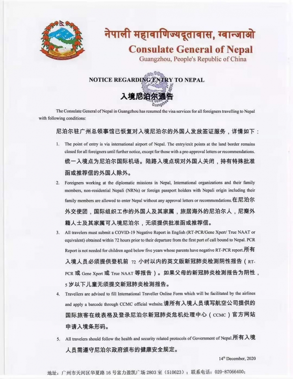 12月14日起,尼泊尔驻广州总领事馆已恢复对入境尼泊尔的外国人发放签证服务,通告如下: