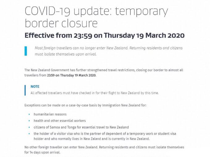 2020年3月19日,新西兰政府通告:19日晚11点59分起,全面进入锁国状态,仅允许新西兰公民和永久居民及其直系亲属入境。新西兰官方建议其他国家旅客尽快离境。