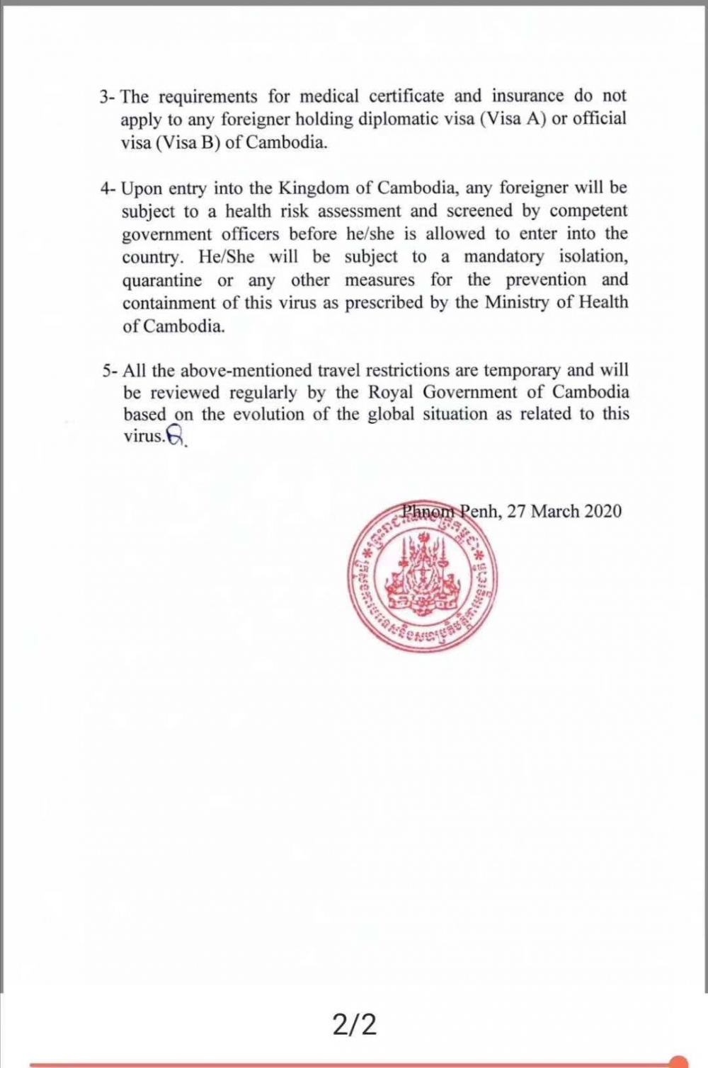 相对其他国家比较人性化的地方是,虽然暂停发放签证,但是柬埔寨已签发的签证仍然有效,可以凭借有效签证入境。但是除了签证外还需要有以下两个条件:1. 健康证明(赴柬前72小时内,有效卫生当局签发) 2. 至少有5万美元保额的保险。无健康证书和健康保险金,则不允许入境。