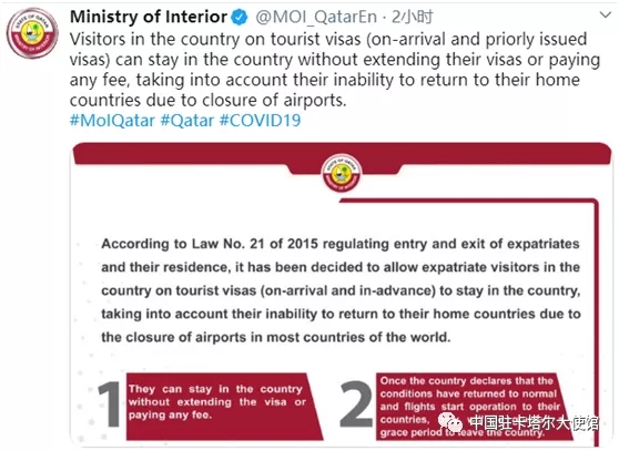 2020年4月20日晚,卡塔尔内政部发布推特称,鉴于多国机场关闭,访卡的外国公民回国不便,持旅游签证(包括提前办理的签证和落地签证)的外国公民仍可在卡停留,无需延期签证,也无需缴纳滞留罚金。该政策将根据实际情况继续延长,直至有关国家机场重新开放,各国公民能够顺利回国。