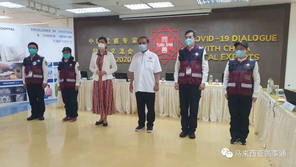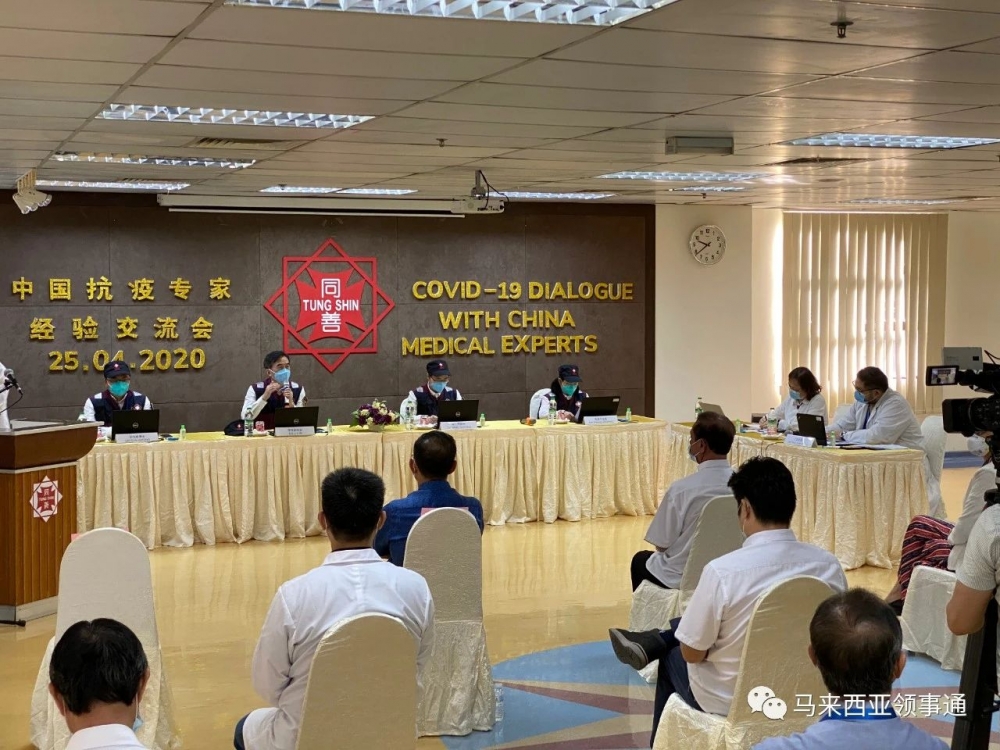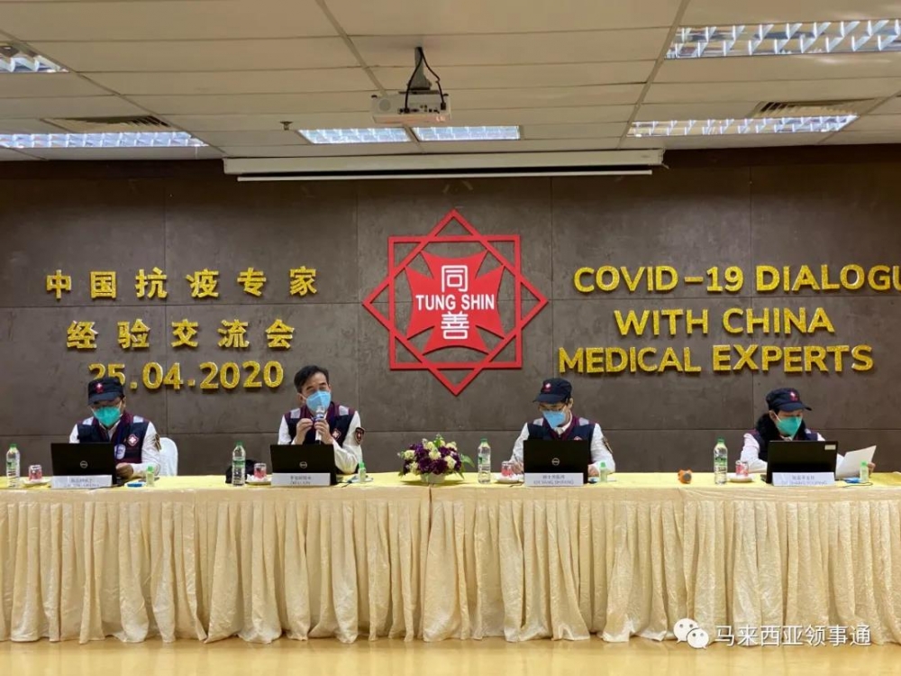 2020年4月25日,中国赴马来西亚抗疫医疗专家组前往马来西亚同善医院,就新冠肺炎的相关治疗经验与当地医生交流。交流会由同善医院主席邱财加主持,中国驻马来西亚使馆领事参赞刘东源出席并致辞。马来西亚卫生部秘书长陈超明和同善医院董事、医护人员等30余人参与了现场交流,其他医院人员通过FACEBOOK直播参与了线上交流。