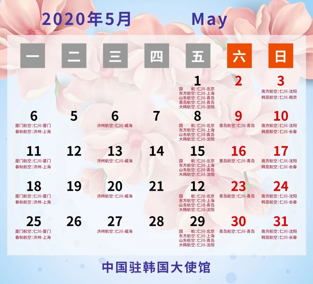 | 5月8日 | 国航 仁川-北京 | 东方航空 仁川-上海 | 山东航空 仁川-青岛 | 大韩航空 仁川-沈阳 | |
