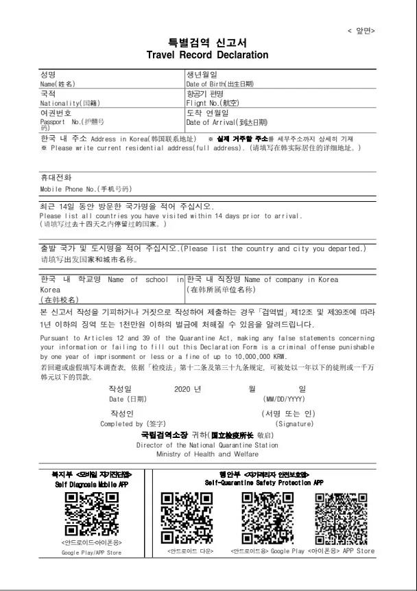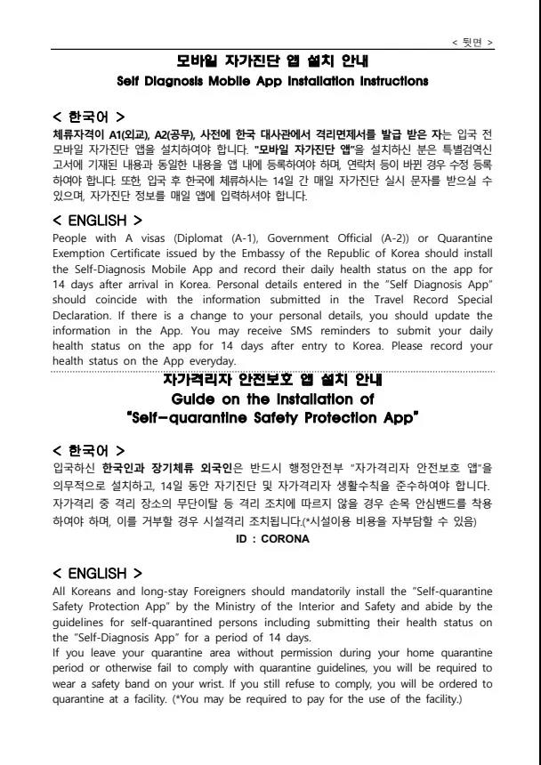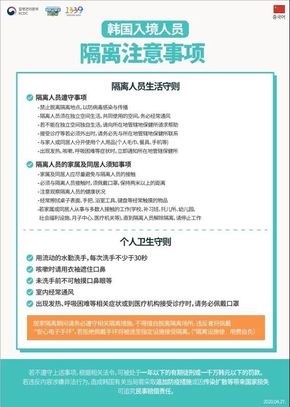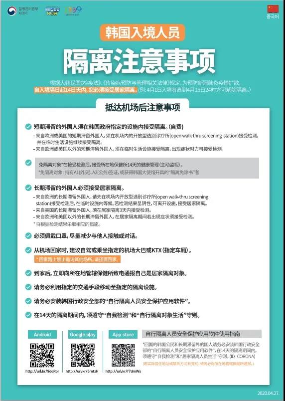 自2020年4月1日起, 韩国政府对所有入境人员实施14天居家隔离或集中隔离的措施,以加强入境防控管理。为有效监督居家观察人员,并防止在居家观察期间擅自外出等违法行为的发生,有关部门还从四月二十七日起开始实施佩戴安心电子手环制度。具体内容详见相关通知等宣传资料。