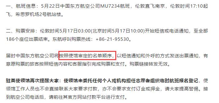目前想要尽快回国只能等临时航班,5月15日左右多个国家均有领事馆组织的临时航班,比如英国、加拿大、美国等。最新5月17日通知的伦敦直飞南京临时航班也开始进入购票阶段,不过并不是任意滞留人士都有订票权限。领事馆组织临时航班时,会先提交一份名单给航空公司,航空公司会根据名单上的顺序进行电话和短信通知订票。名单外人员即使打电话订票,也会被告知不在名单上无法订票。