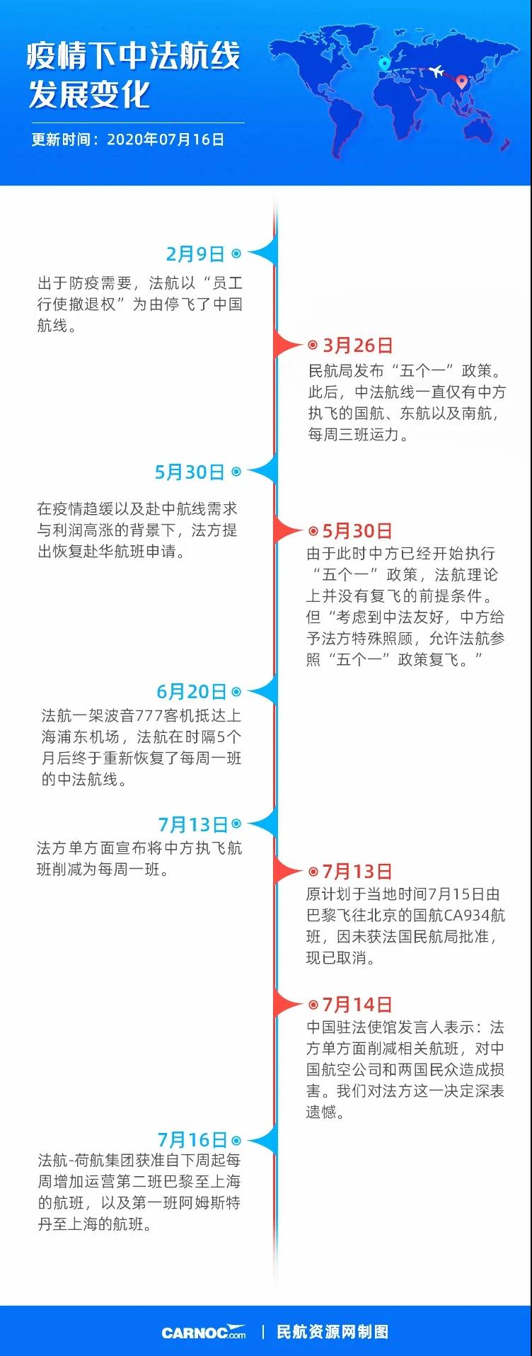 据法国驻华大使馆7月16日消息,法航-荷航集团获准自下周起每周增加运营第二班巴黎至上海的航班,以及第一班阿姆斯特丹至上海的航班。法中两国正在根据双边航空运输协定继续展开积极洽谈,以增加两国间的航班频次。此前,7月13日,法国突然宣布出于对等原则,决定将中国航空公司赴法航班数量由现在的每周三班(国航执飞的北京巴黎航线,东航执飞的上海巴黎航线,南航执飞的广州巴黎航线)缩减为每周一班。中国原计划于当地时间7月15日由巴黎飞往北京的国航CA934航班,因未获法国民航局批准,也已取消。