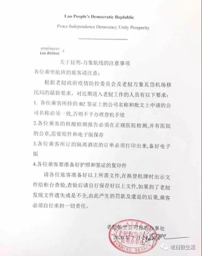 老挝航空公司昆明办事处7月24日发布《关于昆明-万象航线的注意事项》,注意事项称,根据老挝政府疫情防控委员会及老挝万象瓦岱机场移民局的最新要求,对近期进入老挝工作的人员有以下要求: