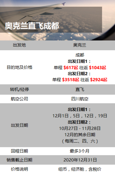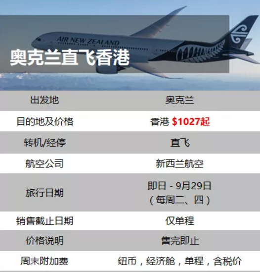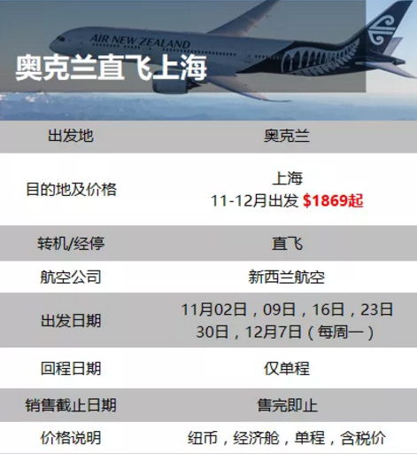 此外还有新西兰航空运行的飞往上海、成都、香港的特价航班机票,也汇总给大家: