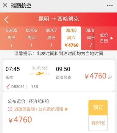 还有一个是瑞丽航空昆明往返西港航班,航班时间为每周六,且记者在其官方微信查询预订发现,昆明至西港价格仅为不到5千元人民币,与其他航班机票相比较为便宜。