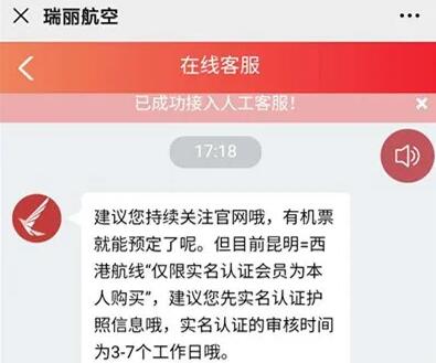 但记者与客服联系后发现,客服称该航线购买前需要实名认证,而实名认证需要3-7个工作日。