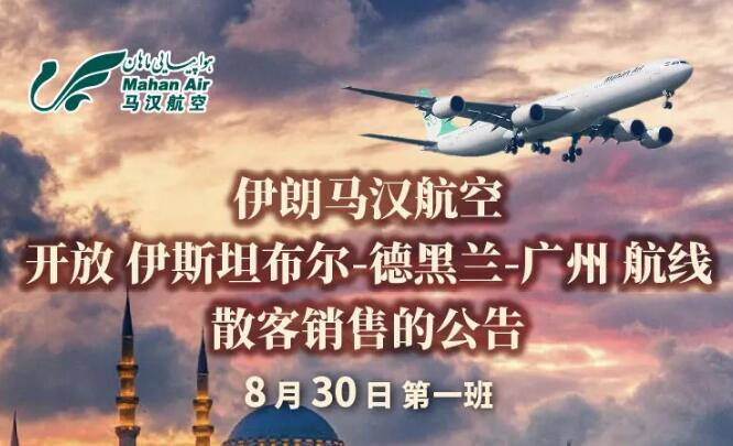 马汉航空自7月20日复航已开放德黑兰直飞广州,迪拜-德黑兰-广州预订,现新增土耳其航线订座,伊斯坦布尔经德黑兰飞广州,8月30日第一班,欢迎登陆马汉中文官网