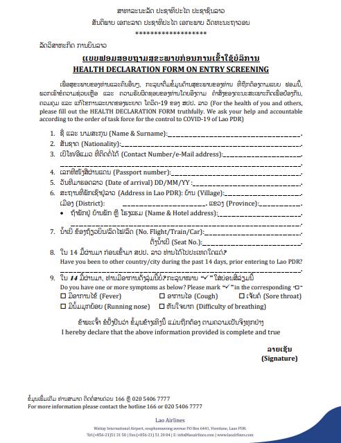 2020年8月3日,据老挝航空官网通知,为了个人和他人的健康, 所有旅客进入老挝,登机前必须如实填写健康申明卡。老挝航空根据老挝政府防疫COVID-19疫情政策,希望大家能够配合。