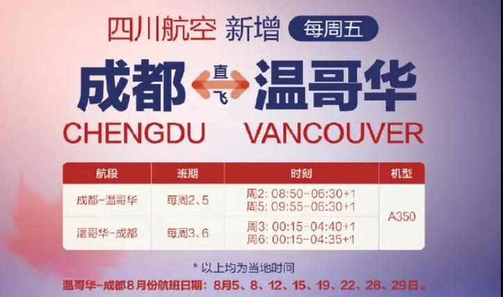 四川航空在符合国家防疫相关规定确保防疫安全的前提下,新增成都=温哥华加班航班。班期信息如下: