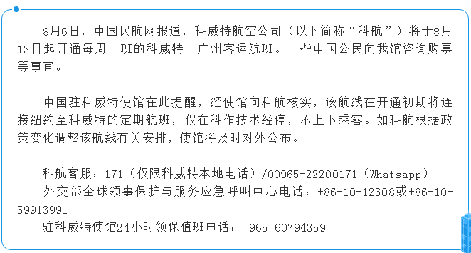 2020年8月13日,科威特航空恢复科威特直飞广州航班,每周一班。
