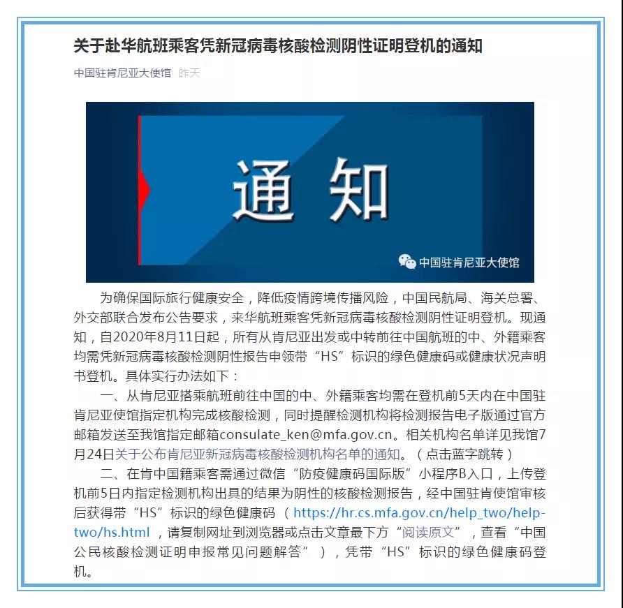中国驻肯尼亚大使馆宣布:2020年8月11日起,从肯尼亚乘机出发或中转赴华的乘客,须凭登机前5天的新冠病毒核酸检测阴性证明申领带“HS”标识的绿色健康码或健康状况声明书办理登机手续。