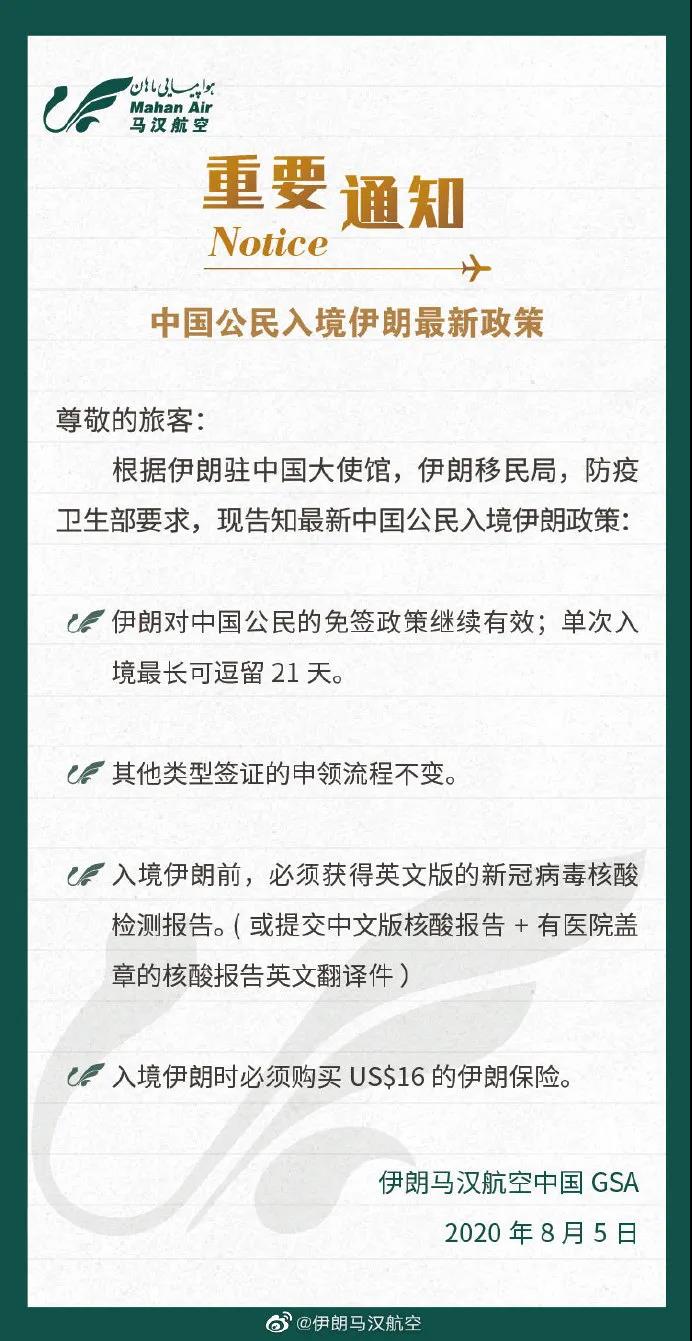 根据伊朗驻中国大使馆,伊朗移民局,防疫卫生部要求,现告知最新中囯公民入境伊朗政策: