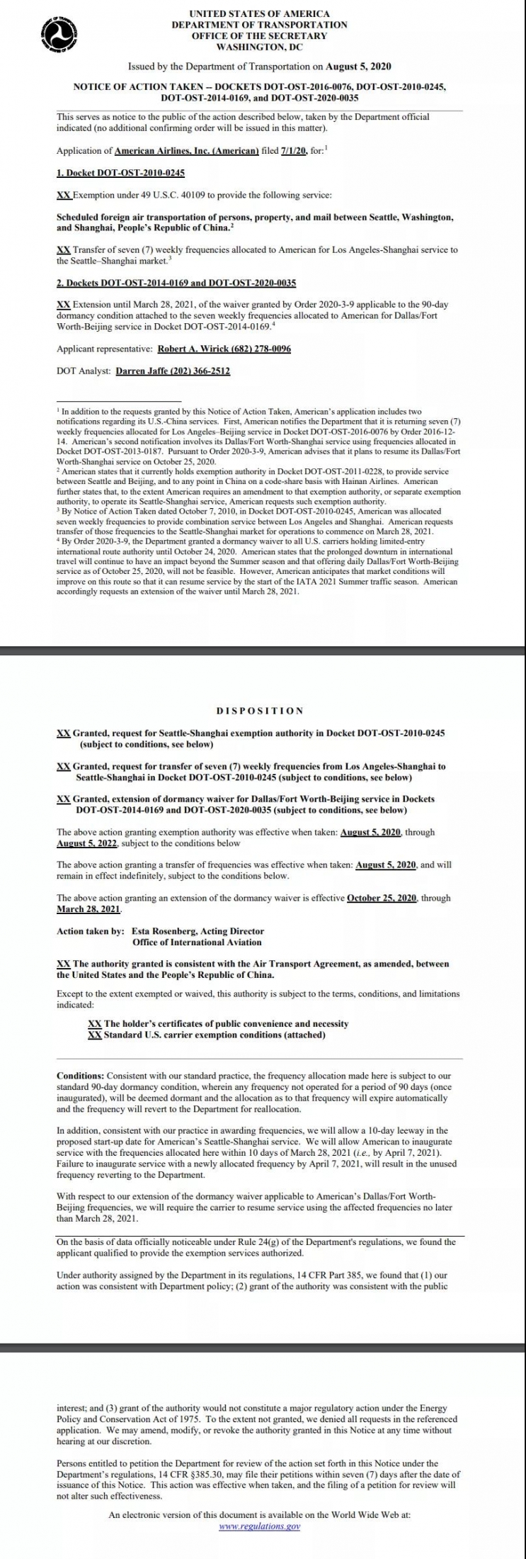此外,美航申请将达拉斯-北京航线的休眠期延长至2021年3月28日,也获得了美国交通部的批准。今年月,美国交通部向所有美国航司授予有限国际航线的休眠豁免,时间至2020年10月24日。美航认为,国际旅行持续低迷的影响将超过夏航季,自10月25日恢复达拉斯-北京航线并不可行。因此美航申请延长豁免至2021年3月28日。