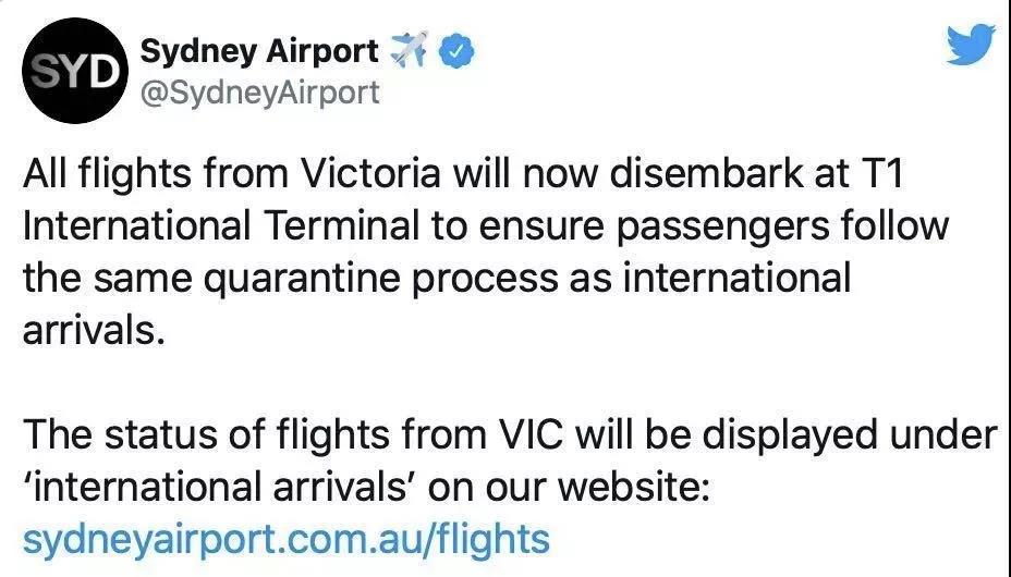 悉尼机场早些时候宣布,所有从墨尔本飞往悉尼的航班,将全部停靠悉尼机场国际航站楼。也就是说,从维州飞抵悉尼的人员,将和其他飞抵悉尼的国际旅客一样,使用国际到达通道,那么目前实行在国际旅客身上的入境隔离政策也将很有可能适用于维州旅客。