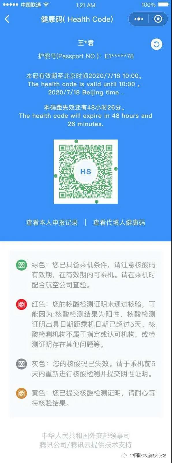 经中国使馆复核通过后,当事人可获得带“HS”标识的绿色健康码。